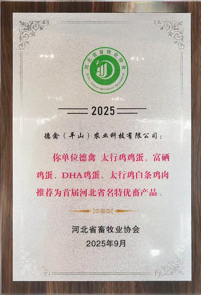 洛杉奇公司旗下全資子公司德禽(平山)農業科技有限公司生產的“德禽”牌雞蛋和白條雞產品憑借安全的品質、濃郁的口感、良好的口碑在眾多參評雞蛋中脫穎而出,獲得“河北省名特優畜產品”榮譽稱號。